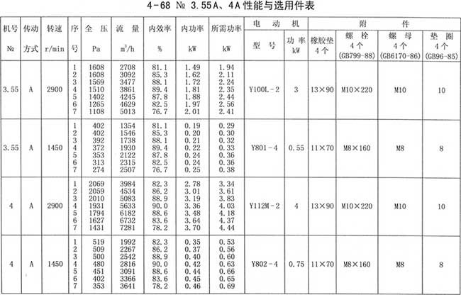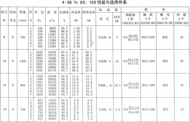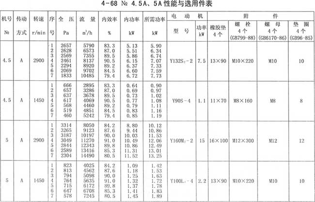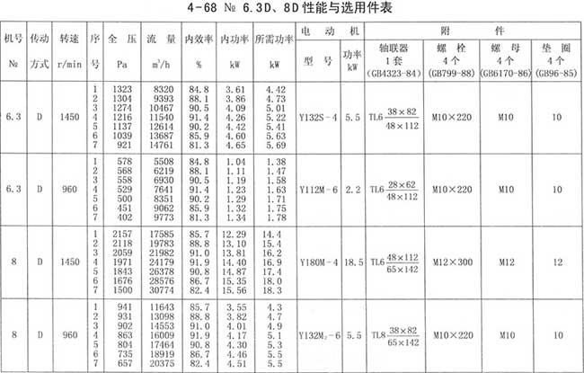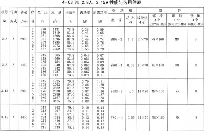機號為2.8~5的4-68型風機主要由葉輪、機殼、進風口等直聯電機的分布部件組成。 NO6.3~20號除上述部分外還有傳動部分。